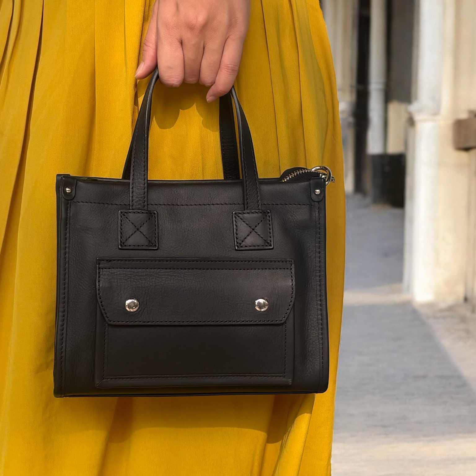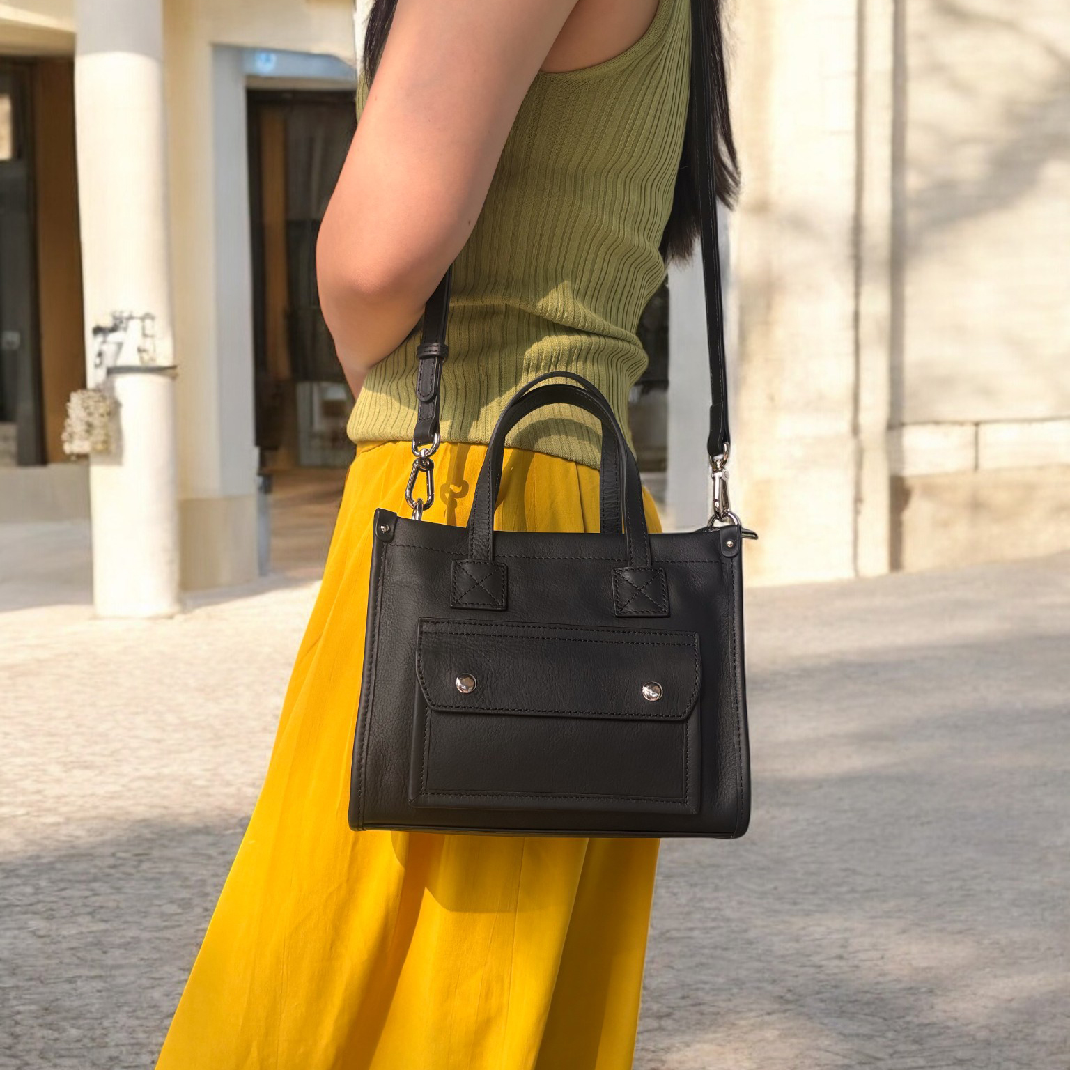 以細緻真皮打造挺拔輪廓,結合俐落線條與實用設計,呈現低調而現代的質感風格。前側翻蓋口袋設計,方便快速收納常用小物,提升日常使用效率。內部空間充足,可輕鬆放入長夾與隨身物品。附可拆式長背帶,支援手提、肩背與斜背多種背法,無論通勤或外出,都能兼顧造型與機能。